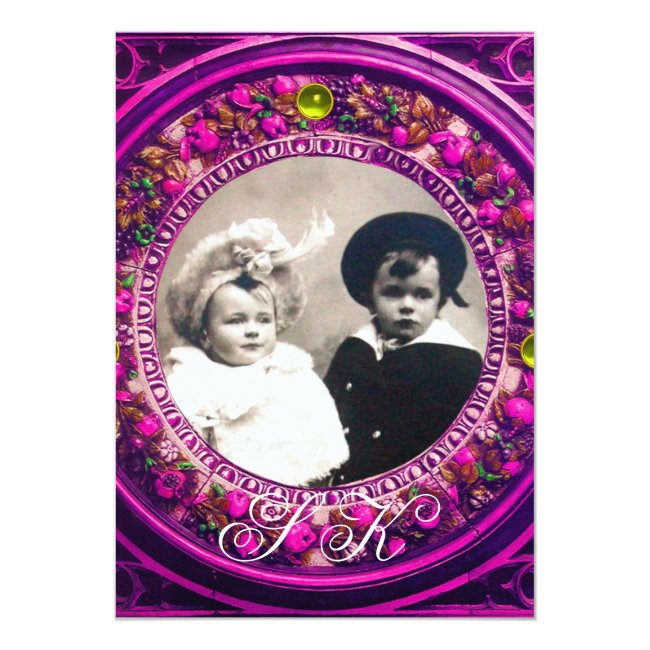Elegant ,classic,vibrant Renaissance fine art ,masterpiece from Bottega della Robbia ( Florence - Italy ) .Classy round /circle shape photo template invitation in gold yellow,purple,pink,fuchsia,violet colors with bright 3D yellow topaz gem stones easily customizable with your text and initials Artistic and cool design, easy to customize as a wedding ceremony, nuptial announcement card ,place cards ,save-the-date card, thank you card ,baby showers,bridal showers, Sweet 16, Quinceanera birthday parties,Bat Mitzvah,romantic engagement showers, Christmas,,holiday ,office ,family reunions ,new year's day eve celebrations,anniversaries,gatherings,school graduations,concert,recital or just about any event you wish!