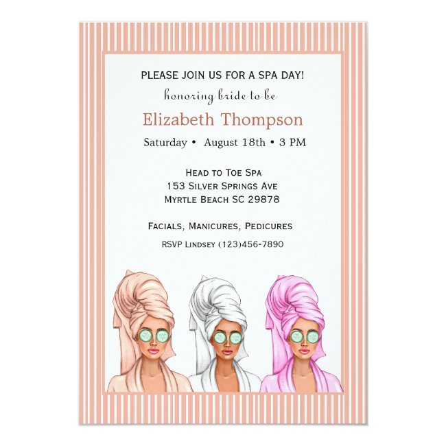 Invite your wedding party and friends to a fun day at the spa with facials, manicures, and pedicures for all. Design has ladies with cucumbers on their eyes and towels on their hair. Customize with your Spa Day details.