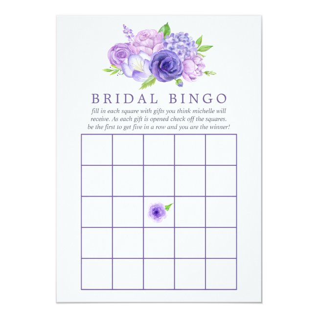 Watercolor floral bridal shower bingo cards featuring color of the year 2018 ultra violet with shades of purple and sage green accents. Flowers include hydrangea, lavender, peonies and roses.