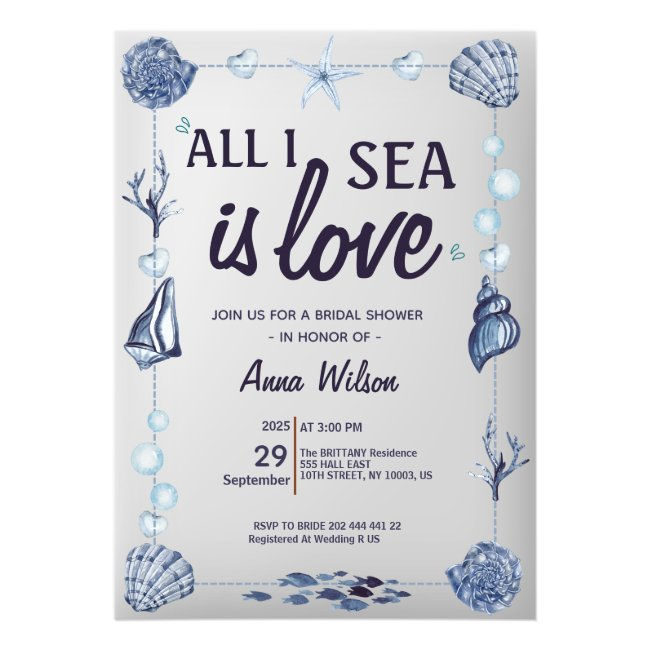 Chic All I Sea Is Love Bridal Shower Watercolor seashell Invitation, Make waves with this elegant and whimsical “All I Sea Is Love” Bridal Shower Invite, featuring soft watercolor navy blue seashells, starfish, coral, and ocean-inspired hues. This design perfectly captures coastal romance with its delicate hand-painted elements and modern typography. Ideal for a beach bridal shower, seaside celebration, or destination wedding event, this invitation blends ocean charm with chic sophistication. Customize with the bride’s name, date, time, and location to make it uniquely yours. A lovely choice for the bride who dreams of sea breezes, sandy toes, and salty kisses.