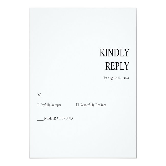 Our Elegant Simple Typography Wedding RSVP Enclosure Card offers a marriage of tradition and modern flair. This minimalist design features a crisp, clean font on a flawless white backdrop, inviting guests to respond with grace. Reflecting a seamless blend of elegance and simplicity, it's perfect for couples who appreciate the beauty of understatement. Each RSVP is a polite nod to formality, with a contemporary twist that promises a stylish event to come.