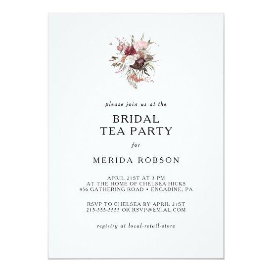 This burgundy boho floral bridal tea party invitation is perfect for your elegant bohemian summer tea party. With modern dusty rose watercolor flowers, dark greenery, and including touches of peony, butterfly, and blush pink, it's sure to complete the look you desire.