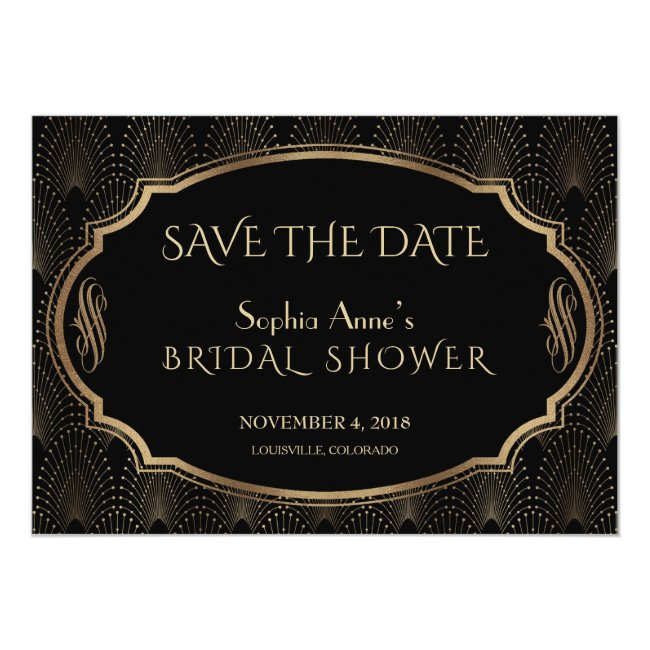 Charming Roaring 20s, Great Gatsby Vintage Art Deco Bridal Shower SAVE THE DATE Invitation. A black and gold 1920's inspired card design features faux gold foil vintage oval shape and ornaments, beautiful style of Art Deco as background. Use Personalize tool to add your info. See, also, my Charming Great Gatsby Art Deco The 1920s was a time prohibition, gangsters, speakeasy parties, jazz music, and flapper girls.