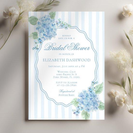 A vintage-inspired, classic, and elegant cottage grandmillennial design featuring a Victorian English garden aesthetic. Delicate watercolor blue hydrangeas and charming forget-me-not flowers are arranged against soft blue preppy stripes with a scalloped hand-drawn oval frame.