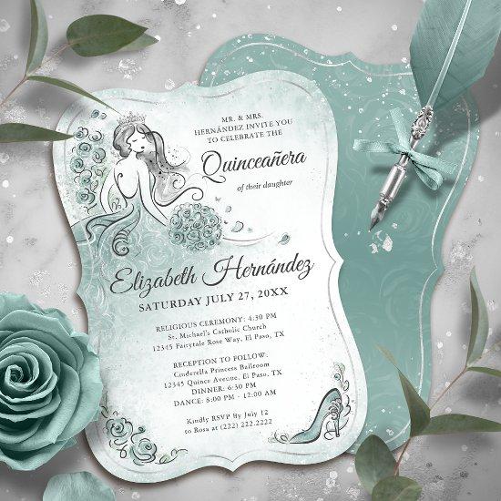 Looking for elegant party ideas with a light sage seafoam green and silver palette for a quinceañera, sweet 15 or 16, wedding, or other magical party? Create your own fairytale atmosphere with personalized princess invitations made with original art by Raphaela Wilson. This beautiful, enchanting DIY template card showcases watercolor roses in soft shades of light teal, seafoam green and sage, along with a fancy high heel shoe, a bouquet adorned with pretty faux silver butterflies, and a regal princess wearing a tiara and flowing dress. The magical aesthetic includes unique ink detailing and faux metallic silver elements throughout the floral accents, butterfly confetti, gown, hair, and filigree border, all layered atop a white watercolor backdrop. The backside of this invite is embellished with an elegant rose pattern, creating a perfect space to add a special mis quince anos photo or engagement picture, along with other custom event details. You can customize all calligraphy script and modern typography, and easily change out the English to Spanish wording if desired. Whether you happen to be planning a milestone birthday party, a royal princess wedding, or a seafoam green bridal shower, these versatile editable DIY invitations / RSVP templates are designed to suit a variety of unforgettable fairy tale celebrations. Category: dress birthday invites for seafoam green quince theme, once upon a time fairy tale wedding invitations; and butterfly princess quinceanera invitations XV. Silver and seafoam green quinceañera theme colors: deep teal, blue evergreen teal, dark ocean green, pale sage, light sage green, dusty aqua, light seafoam, mint, light gray, dark grey, faux metallic silver, black and white.