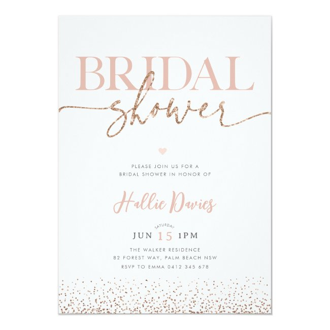 A pretty blush and faux rose gold glitter modern bridal shower invitation. Customise the pink to any colour to suit your theme. Comes with option to add your photo on back of invitation (or delete the back if you'd prefer just single sided invitation). A simple, elegant, pretty invitation for your bridal shower or kitchen tea.