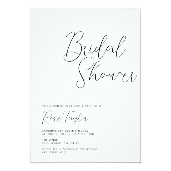 Celebrate the bride-to-be with this modern minimalist bridal shower invitation with elegant script font.