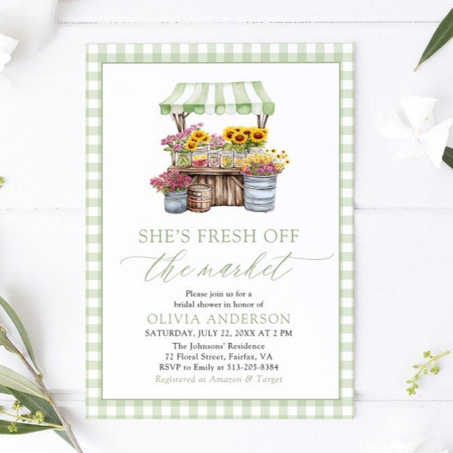 Green Gingham She’s Fresh Off the Market Bridal Shower Invitation ?? Celebrate the bride-to-be with this charming farmer’s market-inspired bridal shower invitation! Featuring a soft green gingham background, a watercolor flower stand overflowing with sunflowers and wildflowers, and elegant calligraphy, this design is perfect for a rustic, garden, or spring-themed shower. ? The editable template lets you easily customize all text—names, dates, locations, and more—no design experience needed! ?️ Fresh, cozy, and full of personality, this invite sets the perfect tone for a day of love, laughter, and sunshine. ☀️ Just personalize, print, and get ready to shower the bride in market-fresh style! ?