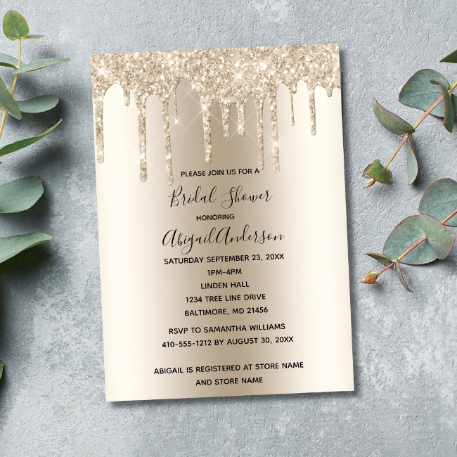 A bridal shower invitation that is glam and trendy. Champagne colored dripping glitter. Personalize all sections of the invitation.