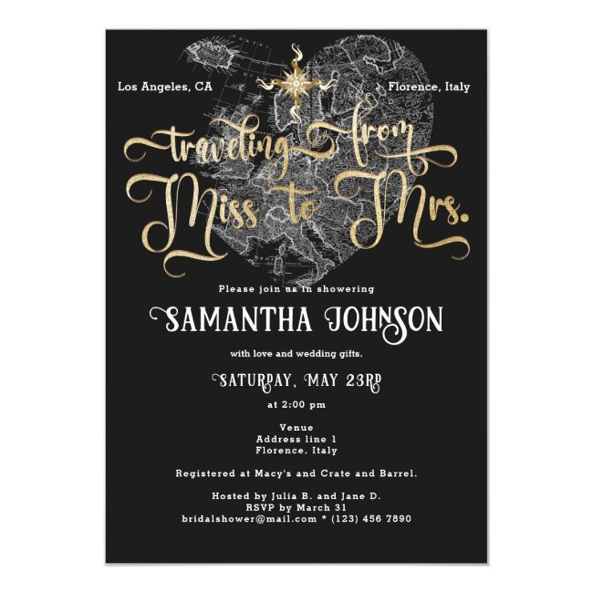 For your destination wedding, choose this Miss to Mrs. Pink ♥ Heart Map Travel Bridal Shower Invitation and celebrate the bride-to-be or the future couple. The design features a pink travel map with a heart shape and a vintage compass. The theme is written with a pretty hand-written script, in faux gold. Easily customize the design to fit your event. For matching items, please check my collection. For assistance or custom orders, please send a message via Zazzle chat. Thank you!